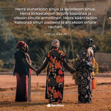 4. Moos: 6:24–26 Herra siunatkoon sinua ja varjelkoon sinua, Herra kirkastakoon sinulle kasvonsa ja olkoon sinulle armollinen. Herra kääntäköön kasvonsa sinun puoleesi ja antakoon sinulle rauhan.