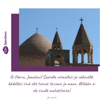 Rukoilemme kaikkien Iranissa vangittujen kristittyjen puolesta. Anna heidän tuntea Pyhän Hengen läsnäolo, vahvista heitä toivossa ja auta heitä pysymään lujina totuudessa.