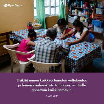 Isä, siunaa Alician perhettä ja muita heidän kaltaisiaan perheitä tänä jouluna. Rukoilemme, että ”Immanuel – Jumala kanssamme” ei olisi vain kaunis joulun korulause vaan todellisuutta, jota he saavat kokea kodeissaan ja seurakunnissaan.