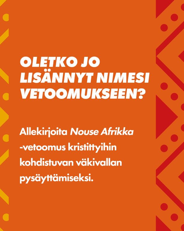 Lisäksi kampanja vaatii suojelua, oikeutta ja aiemman aseman palauttamista väkivallasta kärsiville veljillemme ja sisarillemme – myös niille, joiden elämää viimeisimmät hyökkäykset ovat ravistelleet.
