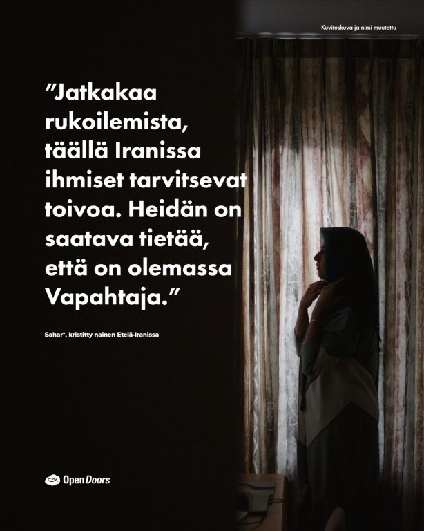 – Tärkein on rukous. Haluan kiittää kaikkia, jotka rukoilivat myös minun ja perheeni puolesta! Muistakaa edelleen vangittuja Iranissa. Rukoilkaa myös yhä kasvavien seurakuntien puolesta, jotta ne voisivat toimia turvassa ja kristityt saisivat kasvaa uskossa. He tarvitsevat kaikkea sitä tukea, jota Open Doorsin kautta on mahdollista saada.